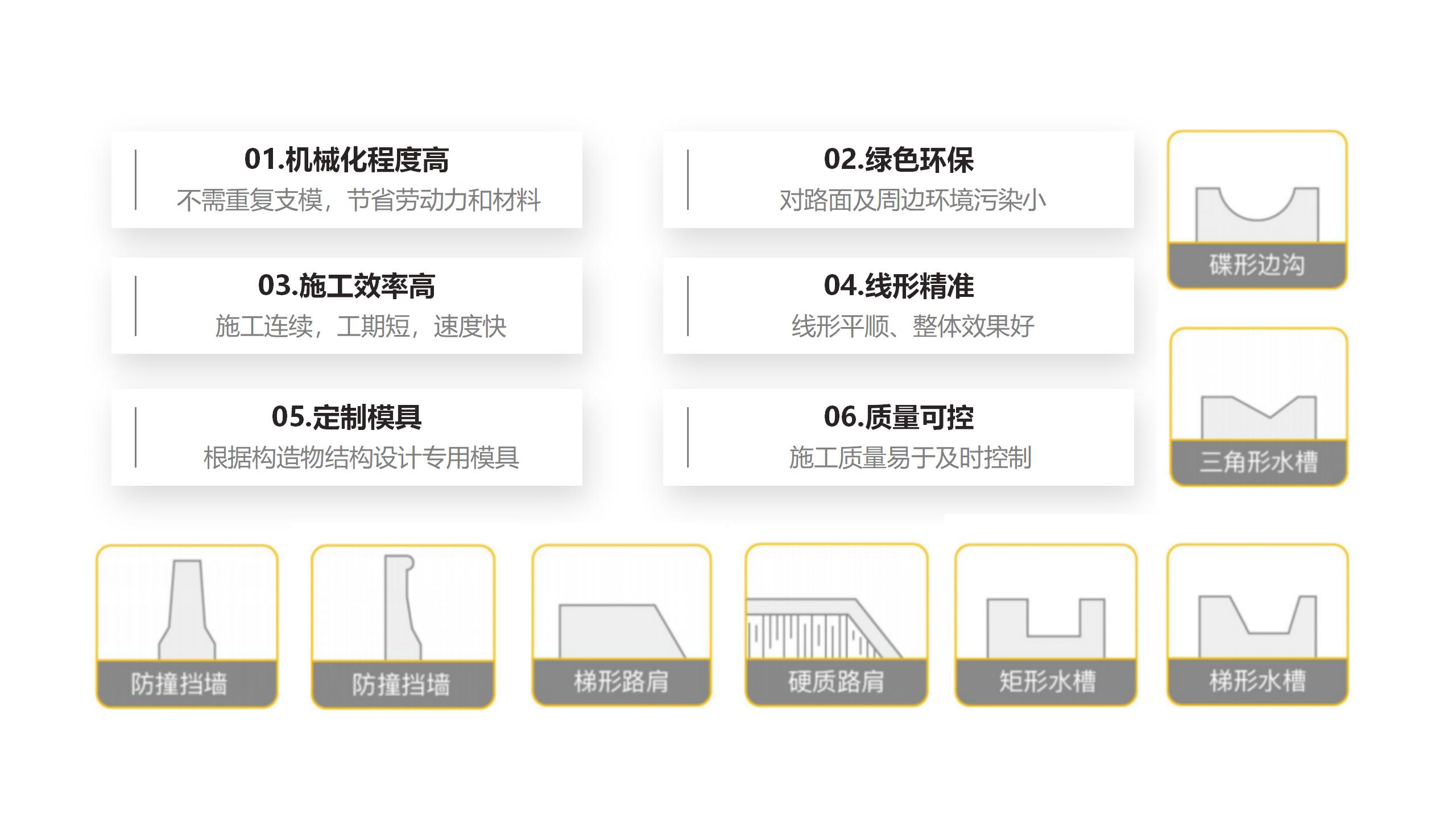 随着我国公路建设公路建设规模和等级不断提高,路面工程中如路肩、防撞挡墙、排水沟等水泥混凝土构造物施工建设中,滑模摊铺式现浇混凝土以独特的技术优势,逐步替代人工支模版现浇、预制厂预制现场安装等传统施工方法,已成为路面施工的主导技术。 依托全液压设备自动化、智能化等技术优势,研制了智能滑模摊铺机。该机型参数等同或优于国外同类产品。借助自身设备优势,以及丰富的滑模施工经验,已参与国内多个道路建设项目的滑模摊铺工程。